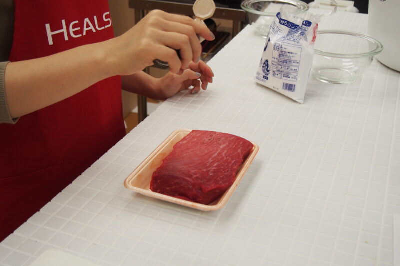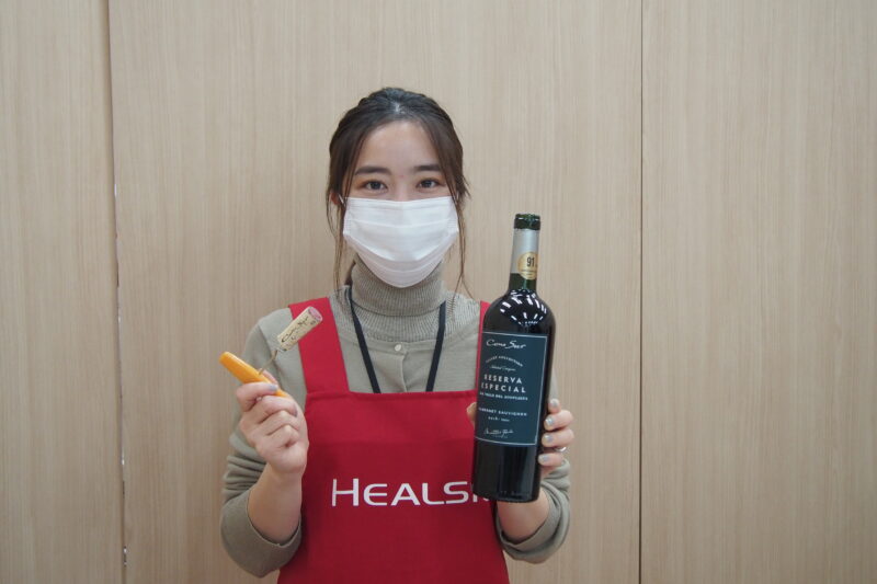 今回、料理に使用したワインは現在ヘルシオデリで販売している「赤ワインを始める3本セット」の中にある「カベルネソーヴィニヨン」です。赤身の多い、もも肉などを使用する際はこちらがオススメです。一方、すじ肉のような脂身の多い肉を使用する際は、「ピノノワール」がオススメ、とのことです。