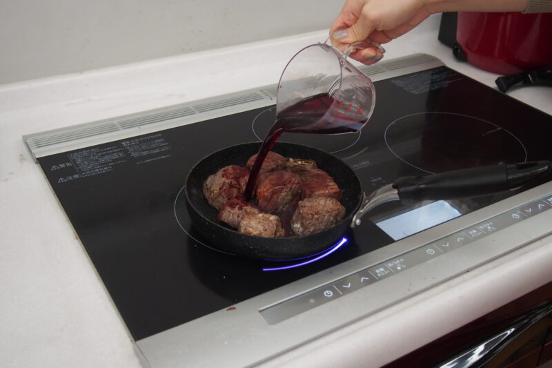 表面が焼けたら、赤ワイン大さじ4杯を入れ、沸騰させます