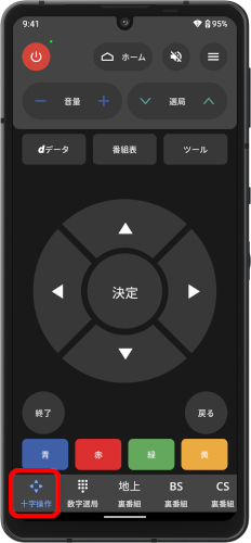 例えば、画面上段には使用頻度の高い電源、音量、選局などの操作ボタンを固定表示し、中段には十字操作キーや数字選局などを表示できるようにしています。中段の表示は下段のタブメニューで切り替えられるようにしています。