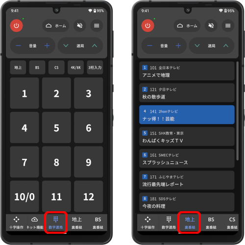 (左)「数字選局」、(右)「(地上波)裏番組選局」