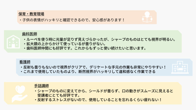 例えば、歯科医院では患者さんと歯科医師や歯科衛生士の顔が比較的接近するため、患者さんにより安心していただきたいと、フェイスシールドをご利用くださっています。曇らず、周囲の光を反射することもないので、ストレスなく正確な治療ができるとご好評をいただいています。