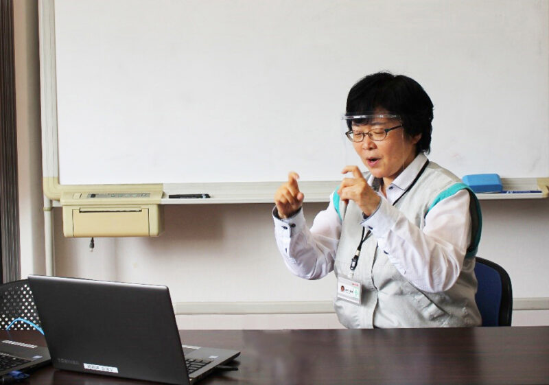 この日、出前授業の講師を務めた田中は、聴覚障がいのある社員です。普段は、シャープからの発注を中心とした資料の電子化業務に携わっています。田中は、出前授業では口元をよく見せることを優先するため、フェイスシールドを使用して話をする際は、マスクを外します。通常は、フェイスシールドを使用する際は、マスクの併用をおすすめしています。