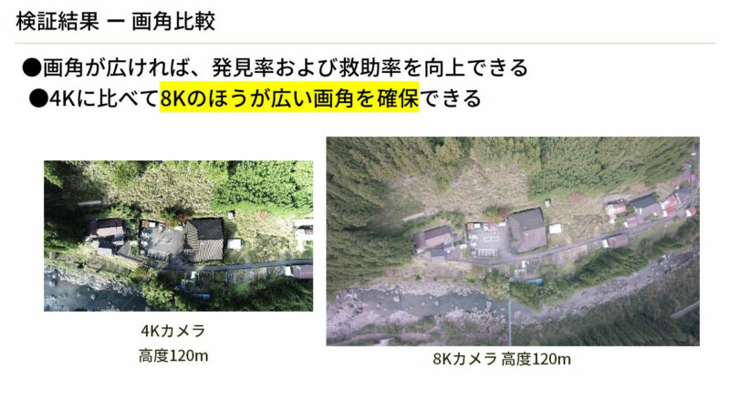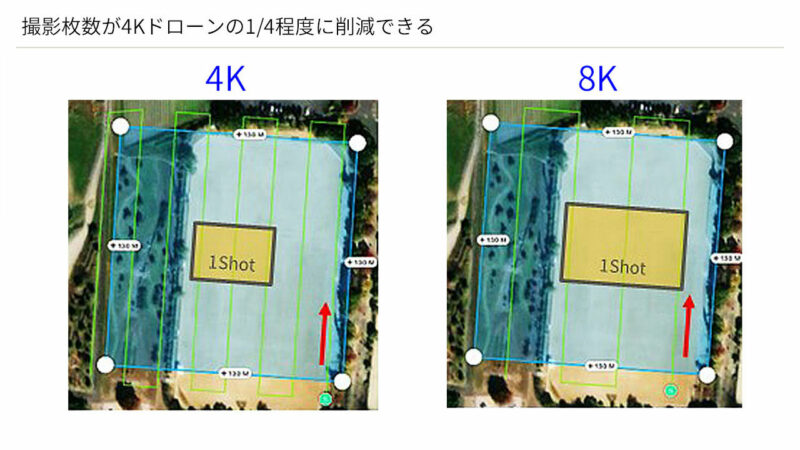高度120mからの撮影においても、8Kでは解像度を確保したまま、より広い画角を確保できます。