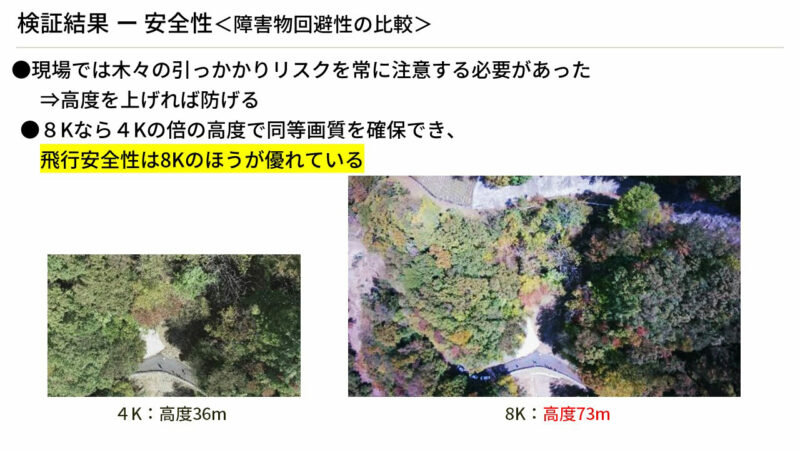 また、解像度を確保するために低い高度から撮影すると、ドローンが木々などの障害物に接触してしまうリスクが高くなります。検証では、8Kドローンは4Kの約2倍の高度から撮影しても、4Kと同等の画質が確保できることが分かりました。今回の検証では、高度73mから撮影しましたが、73mを超える高さの木は滅多にありませんので、8Kドローンなら安全に飛行させることができます。