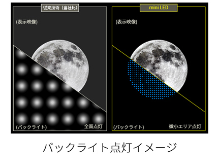 これまでの液晶テレビでも、映像の各部分の明るさに応じてバックライトの輝度を制御する「ローカルディミング」という技術がありましたが、mini LEDを採用したことでこの明るさ制御の最小単位をより細かく分割し、精密に制御できるようになりました。そうすることで、明るいところはより輝き、暗い部分はより暗く引き締まった黒となり、メリハリのあるシーンを再現することができるようになりました。