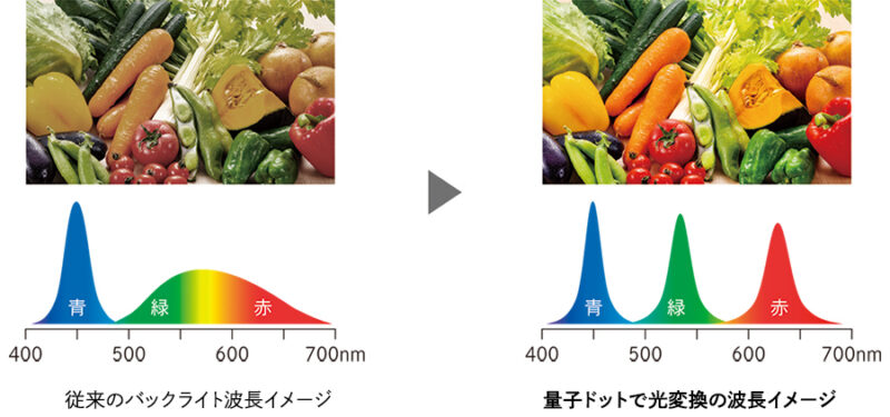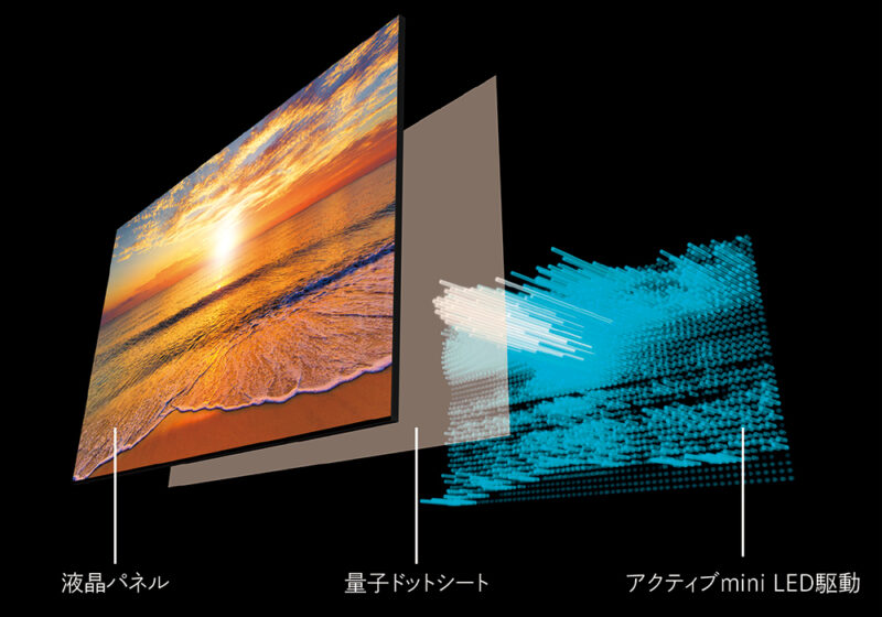 はい、広色域かつ純度の高い3原色を生む「量子ドットリッチカラー」です。「量子ドット」と呼ばれるナノサイズの半導体による光波長変換技術を採用し、mini LEDバックライトの純度の高い青色光から、3原色の青はそのままに、純度の高い緑と赤の光を生成します。再現できる色の幅が広がり、鮮やかな映像を表現することが可能となりました。