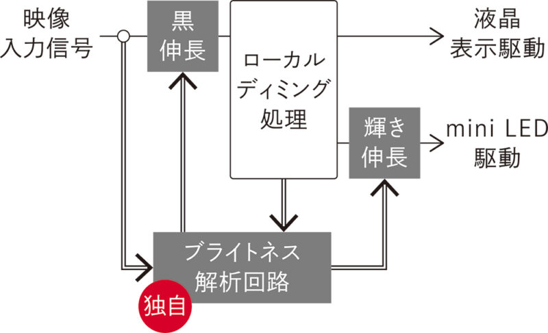 これに加えて、『AQUOS XLED』には「フレアブライトネス」という新機能を搭載しました。映像信号をブライトネス解析回路が解析し、液晶やmini LED制御にフィードバックします。このフィードバックにより、映像の局所的な明るさやコントラストを当社独自のバックライト最適制御に反映し、まばゆいばかりの輝きや締まった黒などをさらに際立たせています。
