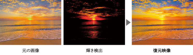 輝度信号を解析して、映像が本来持っている明るさを推測して復元。光の煌めきや、自然界の眩しさなど、リアリティ溢れる輝きを再現します。