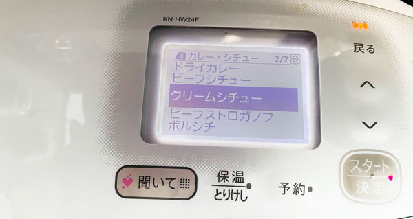 まぜ技ユニットを取り付けた本体に内鍋をセットし、「クリームシチュー」の自動メニューを使って調理スタート。報知音が鳴ったら牛乳を追加し、スタートキーを押して再度加熱します。約45分でできあがりです!