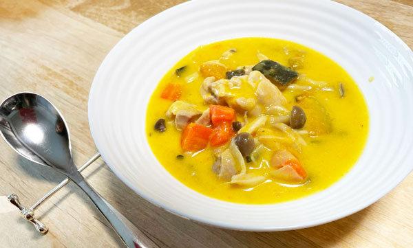 コンソメなどは使わず、鶏肉から出るダシだけでとてもおいしいシチューができあがりました。カボチャやにんじんのやさしい甘さが体にしみわたります。