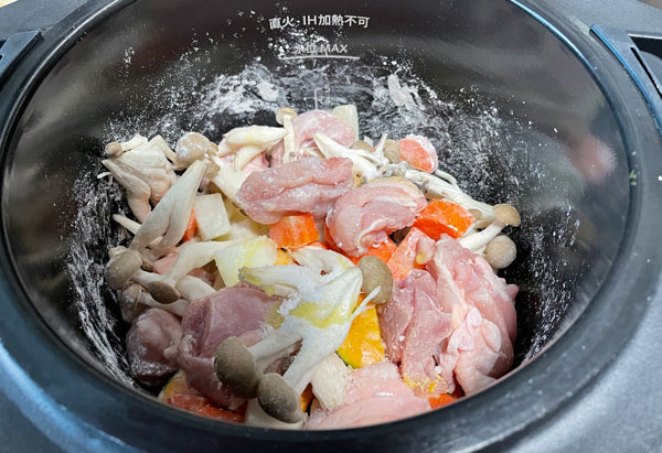 では、調理スタート!一口大に切った野菜と鶏肉を内鍋に入れ、小麦粉をまぶします。公式レシピのクリームシチューのレシピでは、ビニール袋に材料と小麦粉を入れて全体にまぶす方法をご紹介していますが、勝間流では内鍋にすべて入れて鍋をフリフリしてまぶします。まんべんなく小麦粉を材料にまぶさないとできあがりがダマになってしまいますので、しっかりまぶします。
