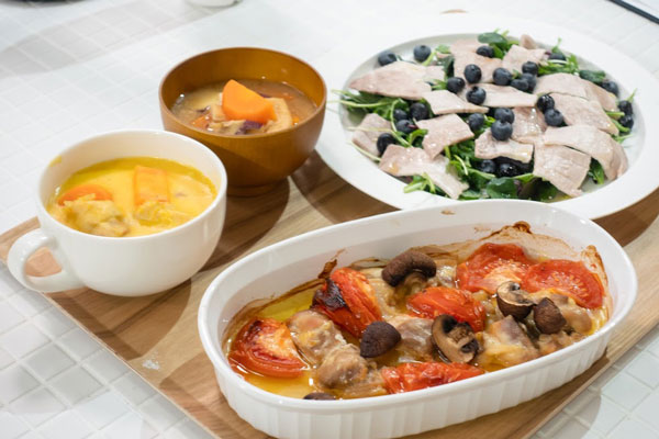こちらができあがりです。どのメニューも作り方は簡単なのに、おいしそう!右上の、豚肉の低温蒸しハムを使ったサラダには生のブルーベリーがあしらわれています。どんな味なのか、食べてみたいですね!