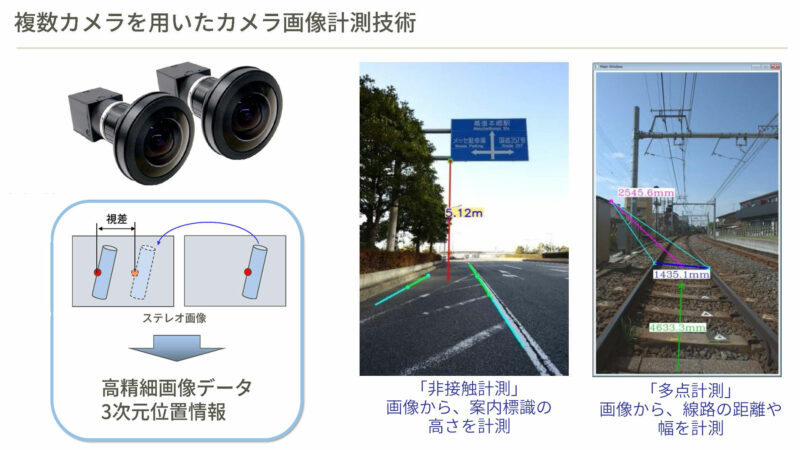 まず、ベースとなるカメラ画像計測技術について説明します。横に並べた左右2つのカメラで同じ対象物を同時に撮影すると、カメラ位置の違いから対象物が少しずれた状態で2枚の画像が撮影されます。この2枚の画像のずれ(視差情報)をもとに高精度の3次元位置情報を算出することで、撮影された画像内の任意の点と点、点と線、点と面の距離や角度が計測できます。例えば、案内標識の高さを直接メジャーで測らなくても、撮影するだけで非接触計測が可能です。また、後からこの案内標識の幅の計測が必要になったとしても、再度現場に行く必要はなく、すでに撮影したデータを使って計測できます。画像に写っているものであれば、多点計測や広範囲計測もOKです。計測(撮影)すると、その場所が撮影されていますので、どの場所か視覚的に分かりやすいのもメリットです。