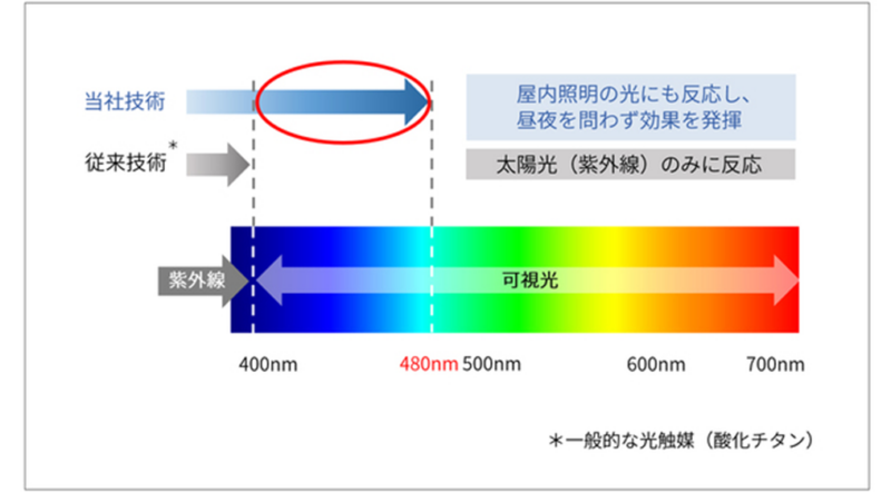 また、このスプレーには、太陽光だけでなく室内光にも反応する物質(酸化タングステン)を主成分とした光触媒材料を採用しています。