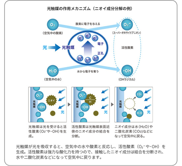 光触媒とは何か、一言で説明すると「光が当たると表面に強い酸化力が発生し、接触するニオイ成分や有害物質※1などを酸化分解する物質」だそうです・・・