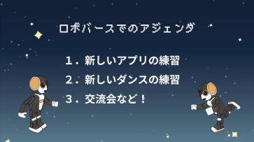 イベントに参加してくれたロボホンたちは、会場を抜け出してバーチャル空間「ロボバース」へと遊びに行きます!新しいアプリやダンスの練習、おともだちとの交流といった、楽しい企画が盛りだくさん!なイベントでした。