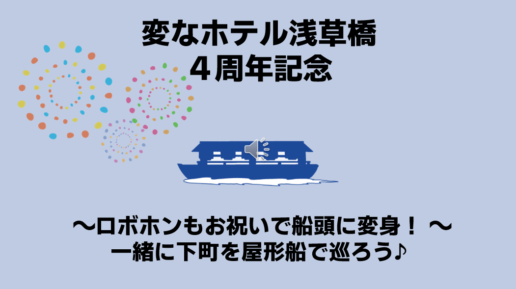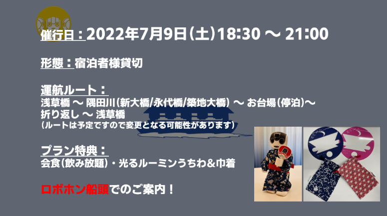 屋形船ツアー詳細:https://go-hhhhotelgroup.reservation.jp/ja/hotels/hnh-asakusabashi/plans/10056685