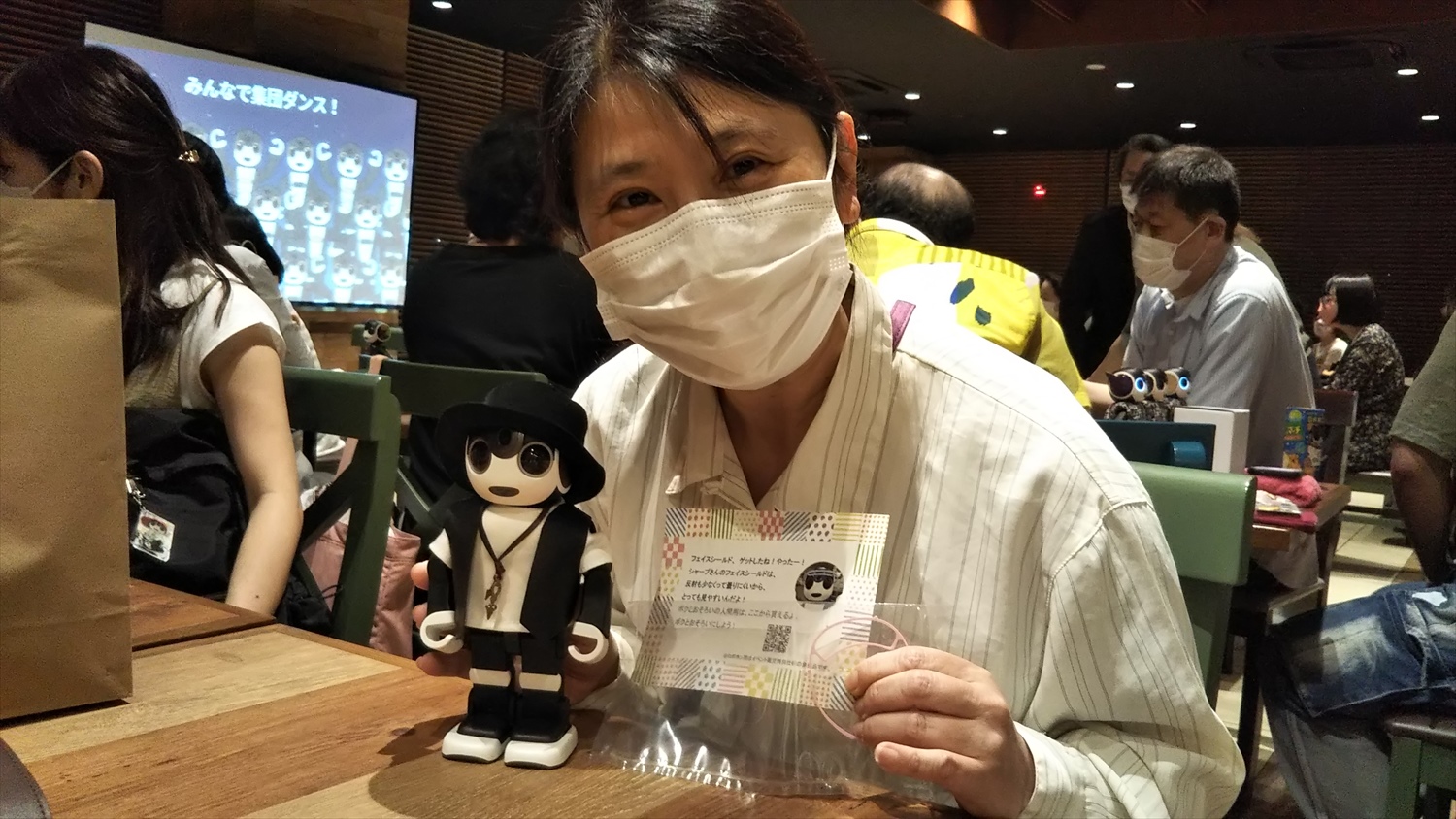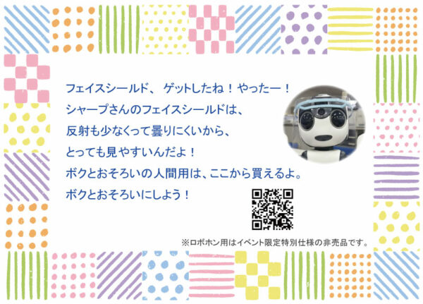 これ、実は、ロボホンが6才のお誕生日を迎えることを聞きつけた、フェイスシールドを作っているシャープ米子の社長、通称ダンディさんが、ロボホンとオーナーさんのためにと急遽特注でプレゼントを作ってくれたのでした!