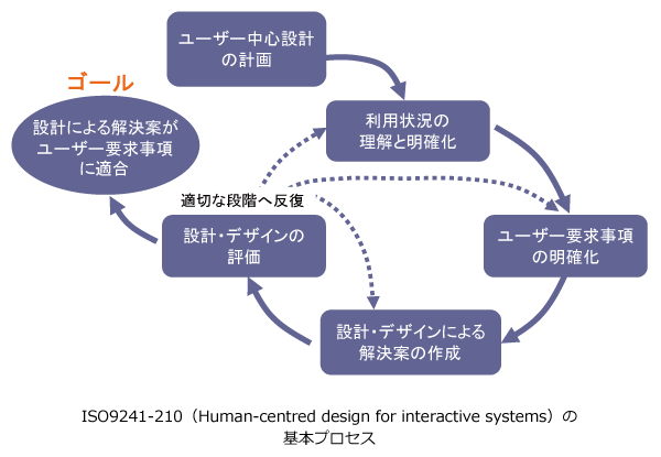 国際規格(ISO9241-210 : Human-centered design for interactive systems)に基づき、作り手がお客さまの視点に立って考え、設計へ反映することで、お客さまが満足する製品・サービスの提供を目指していく考え方です。