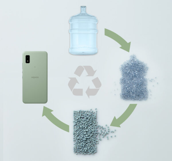 今年1月に発売したAQUOS wish、そして6月に発売したAQUOS wish2。こちらのスマホは、筐体(きょうたい)※1の35%が再生プラスチックでできています。