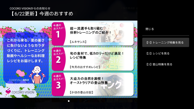 レシピ・料理動画・BGM・おしらせ(キャンペーン・製品情報、テレビの使い方・COCORO STOREなど)