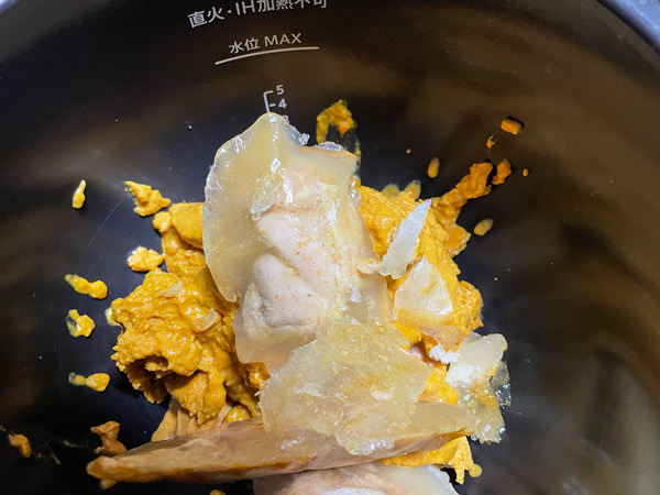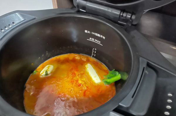 途中、追加投入の合図で、バターと小松菜を内鍋に入れます。