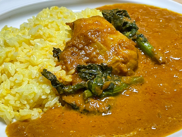 完成です!!!本格的なバターチキンカレーのできあがり。発酵バターの豊潤な香りがふんわり、それでいてスパイシーさも感じられ、めちゃくちゃおいしい!チキンもボリュームがあって、大満足の一皿です。なお、ご飯は別途ご用意いただく必要があります。私はちょっと張り切ってサフランライスを用意してみました。こんなおいしいカレーが手軽に家で食べられるのは、とても嬉しい!