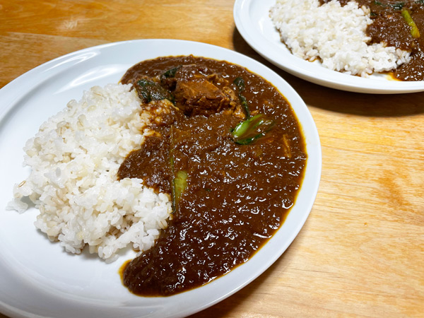 次に、バターチキンカレーと同じように、「牛肉のローストとガラムマサラのスパイスカレー」を作りました。こちらはなかなかスパイシー。小さなお子様には難しいかもしれませんが、やみつきになりそうな味わいです!これは家庭では出せない味ではないでしょうか。ゴロっと入っているお肉も食べ応えあります。ちなみにこちらは雑穀米を用意してみました。