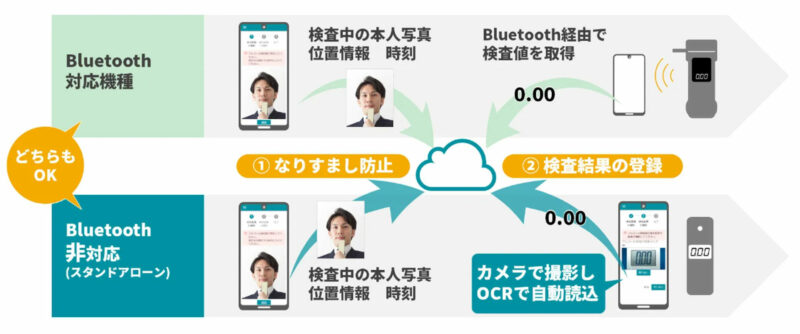 Bluetoothでスマートフォンと連動するアルコール検知器に加え、Bluetooth非対応のスタンドアローンタイプにも対応しています。スタンドアローンタイプの場合でも、スマートフォンのカメラで撮影した画像から検査値を読み取り(OCR機能)、数値を手入力する手間なくご利用いただけます。
