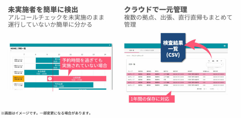 検査状況をリアルタイムに確認し、抜け・漏れを防止することができます。また、クラウドに情報が集まるので、複数の拠点や、出張・直行直帰者などをまとめて一元管理できます。車両予約の機能も備えているため、運行開始の時刻になってもアルコールチェックが行われない場合、画面上にアラートが表示されます。