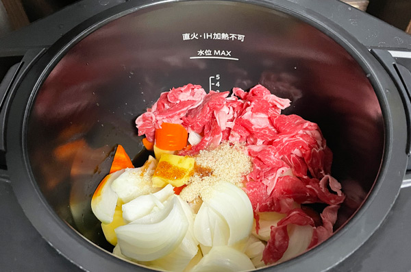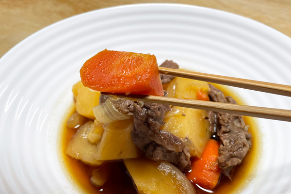 さて、こちらの肉じゃがはある日の「ホットクック」用のキュアプレシャスのおすすめメニュー。にんじんが苦手というお子さまでも、プリキュアのおすすめなら食べられるかも?「ホットクック」の肉じゃがは無水で作るので、にんじんもびっくりするほど甘くなるんですよ。