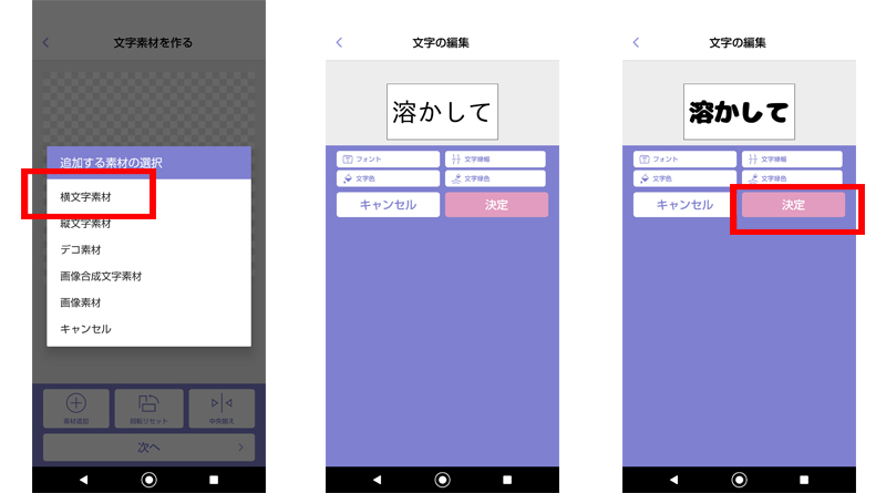 文字素材追加をタップ。先ほど登録した文字素材を選んで位置や大きさを調整します。
