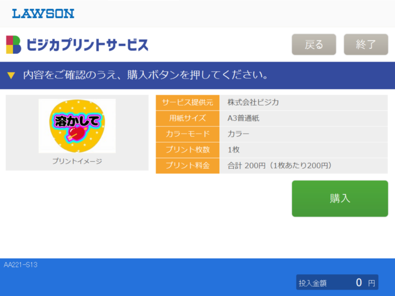 料金、枚数を確認し、購入をタップ。表示されている代金を投入し、あとは印刷を待つだけ!!