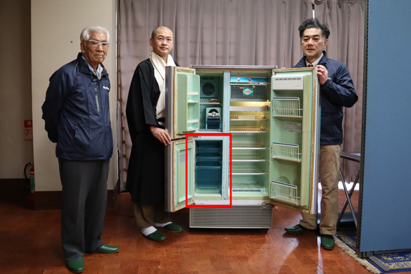 さっそく「ニューアラスカ」とご対面!ここ5~6年ほど使っていなかったということですが、とてもきれいな状態でした。壬生寺の行事の際に、食品や飲み物などを冷やすために使用されることが多かったそうです。電源プラグをコンセントに挿すと、だんだん冷えてきました。50年近く前に生産された冷蔵庫が問題なく稼働することを確認し、当社製品の長期信頼性・耐久性の高さを誇らしく感じるとともに、大切に使って下さったことへの感謝の気持ちでいっぱいになりました。
