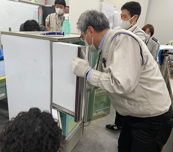 トラックから降ろされた「ニューアラスカ」は、冷蔵庫の技術担当者によって丁寧に磨き上げられました。作業中、その様子を見にやってきたのは同じく冷蔵庫の技術担当者たち。「なるほど、こうなっているのか」など、当時の冷蔵庫の最新技術にみんな興味津々です。
