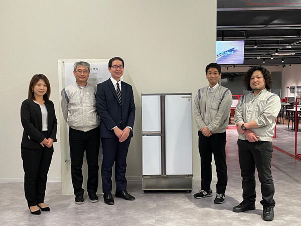きれいになった冷蔵庫は、食堂利用者が毎日目にする「八尾第一食堂」の一角に展示することになりました。この社員食堂には当社の歴史的商品を展示しているのですが、オープンした2021年10月以来、イラストで紹介されていただけの「ニューアラスカ」の実物が登場した記念すべき瞬間です。その設置の様子を杉本社長も見に来てくださいました。