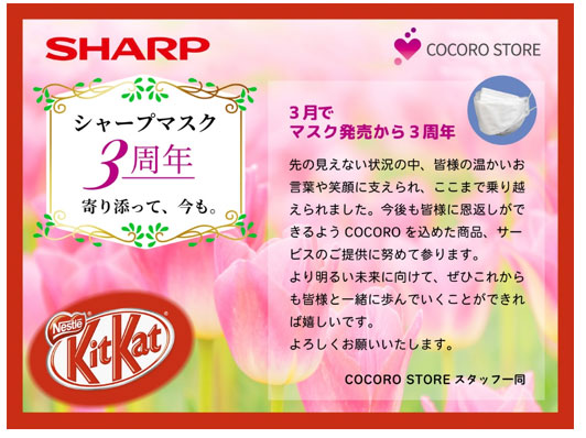 (菅村)はい。社会貢献として開始したマスク事業ですが、現在も多くの方にご愛用いただいております。ご愛顧に感謝して、シャープECサイト「COCORO STORE(ココロストア)」にてマスク、マスク関連用品、もしくはいずれも含む5,500円(税込・送料含)以上の購入で、抽選で600名様に「マスク3周年記念オリジナルキットカット」が当たる「COCORO STOREご購入者様向け3周年記念キャンペーン」を実施中です。