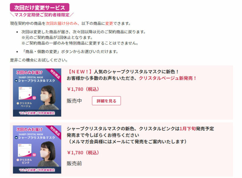 (丸山)多数のお客様からのご要望に応え、カラーマスクの定期便サービスを行うことにしました(3月9日より受付開始)。また、一度試してみたい方のために、次回お届け分だけ色付きの『シャープクリスタルマスク』に変更できる「次回だけ変更サービス」も行っています。