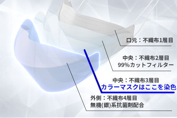 アクリル、ポリエステル、PET・・・など、さまざまな素材を検討しましたが、そうなると、装着感も変わってきます。そこで、今度は素材を変えず、口元から外側に4層目の不織布に色を付けることを考えました。しかし、この4層目の不織布は抗菌加工しており、染色すると抗菌効果が落ちることが分かりました。つまり、抗菌効果をそのままにしようとすれば、4層目は現状の白の不織布を使うしかないんです。そこで、一から工程を見直して、中央2層の外側(3層目の不織布)に色を付けることにしました。これが功を奏して、4層目の白と3層目の色とが合わさり、淡くて艶感のある色が実現できたのですが、私たちが意図した色にするのは、ここからがまた大変でした。