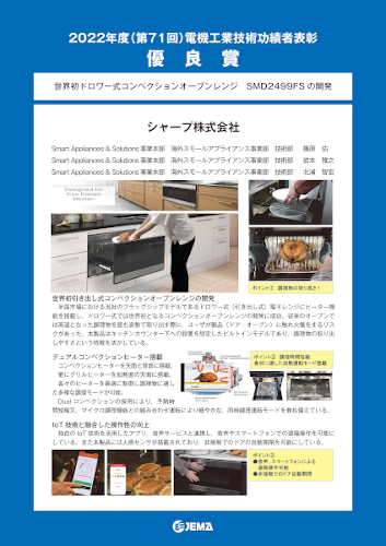 そこで、このやけどリスクを低減するため、自動開閉の引き出し式電子レンジにヒーター機能を付加した世界初※2となる引き出し式熱風(コンベクション)オーブンレンジ<SMD2499FS>を2021年に発売しました。このお客さま視点の商品開発で、(社)日本電機工業会(JEMA)の2022年度(第71回)電機工業技術功績者表彰の「優秀賞」を受賞しました。