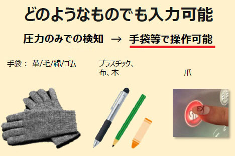 静電容量タッチセンサは、指と(ディスプレイ内の)センサ間で発生する微弱な電気的な変化を捉えることで、ディスプレイに指が触れたことを検知します。しかし、手袋など電気を通しづらいもので触れた場合、電気的な変化は微弱となり検知できませんが、圧力センサを合わせ持つ「クリックディスプレイ」は、「押す(圧力)」ことでも検知が可能なため、分厚い手袋はもちろん、消しゴムやプラスチック製のペンなど、電気を通しづらいものでも入力が可能です。