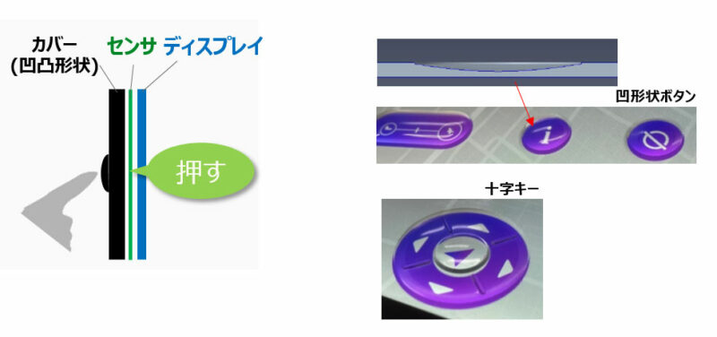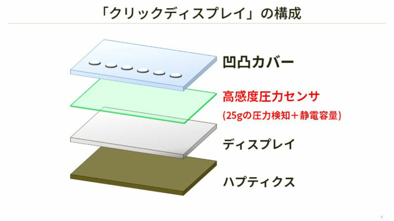(山本)(静電容量タッチセンサを合わせ持つ)透明の高感度圧力センサ※2、ディスプレイ、そしてタッチのフィードバックとして振動させるハプティクスシート、さらにディスプレイの表面を保護し、「押す」部分を分かりやすく示す凹凸カバー、から構成されています。ディスプレイは液晶、有機ELのいずれにも対応可能です。