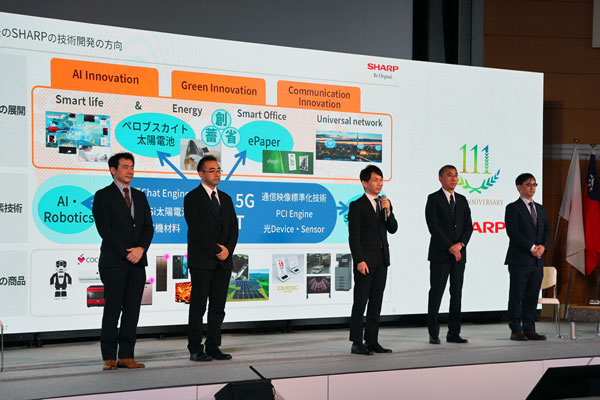 左より、当社 Platform事業推進部長 中田 尋経、シャープエネルギーソリューション(株)エネルギーマネジメント事業統轄部 PV技術部 参事 宮西 晋太郎、常務 研究開発本部長 種谷 元隆、シャープディスプレイテクノロジー(株)開発本部長 伊藤 康尚、当社 新規事業開発統轄部長 今村 公彦