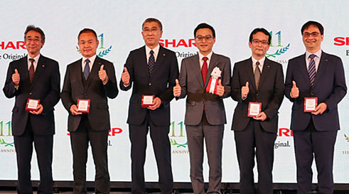 左より、当社 執行役員Smart Appliances & Solutions事業本部長 菅原 靖文、シャープエネルギーソリューション(株)社長 五角 博純、シャープディスプレイテクノロジー(株)開発本部長 伊藤 康尚、CEO 呉柏勲、当社 TVシステム事業本部 TV技術開発センター 統轄部長 高倉 英一、当社 研究開発本部 通信・映像標準技術研究所 統轄部長(新規事業開発統轄部長 兼務) 今村 公彦