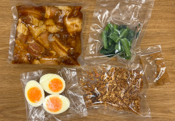 ルーロー飯に添える半熟風卵や小松菜までついています!豚肉はタレに漬け込んだ状態で冷凍してあり、あとはフライドオニオンと八角が入った袋と、五香粉がキットに入っています。たっぷり3人前なので、ご家族で召し上がっていただけます。ごはんは用意してくださいね。