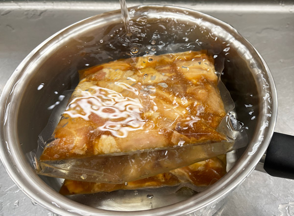 まず冷凍の豚肉を袋のまま数分流水にあてます。基本的にヘルシオデリを調理する際、材料を完全に解凍する必要はなく、内鍋に曲げて入れられる程度に柔らかくなれば大丈夫です。