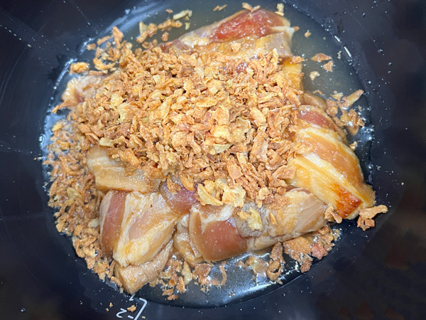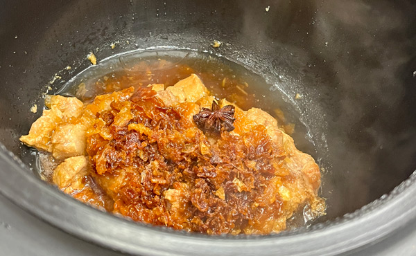 内鍋に豚肉、フライドオニオン・八角と水を入れ、ホットクック本体にセットします。八角が苦手な方は減らしても良いかもしれません。