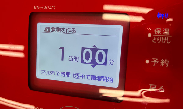 加熱終了後、「取り消し」キーは押さないで!冷凍のままの半熟風卵と小松菜、そして五香紛を内鍋に入れ、延長で10分加熱します。五香紛の量はお好みで調整してください。