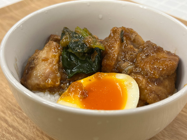 このメニューにまぜ技ユニットは不要です。「煮物を作る(まぜない)→60分」に設定して調理スタート!沸騰するまでの時間と、延長で加熱する時間でトータル85分から95分でできあがります。こちらのルーロー飯は、豚肉をタレに漬けこんだ状態で冷凍してあるので、しっかり下味がなじんでいます。その豚肉を1時間以上かけて煮込むので、味しみしみの豚肉が楽しめるんです。加熱している間に、既にいい香りが漂ってきます。調理室がまるで台湾!