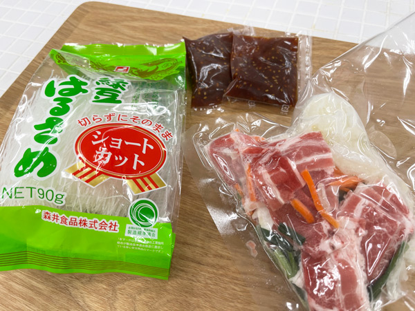 試食用のチャプチェ、作るところから見学させてもらいました。ヘルシオデリのチャプチェを注文すると、こんなセットが冷凍便で届きます。